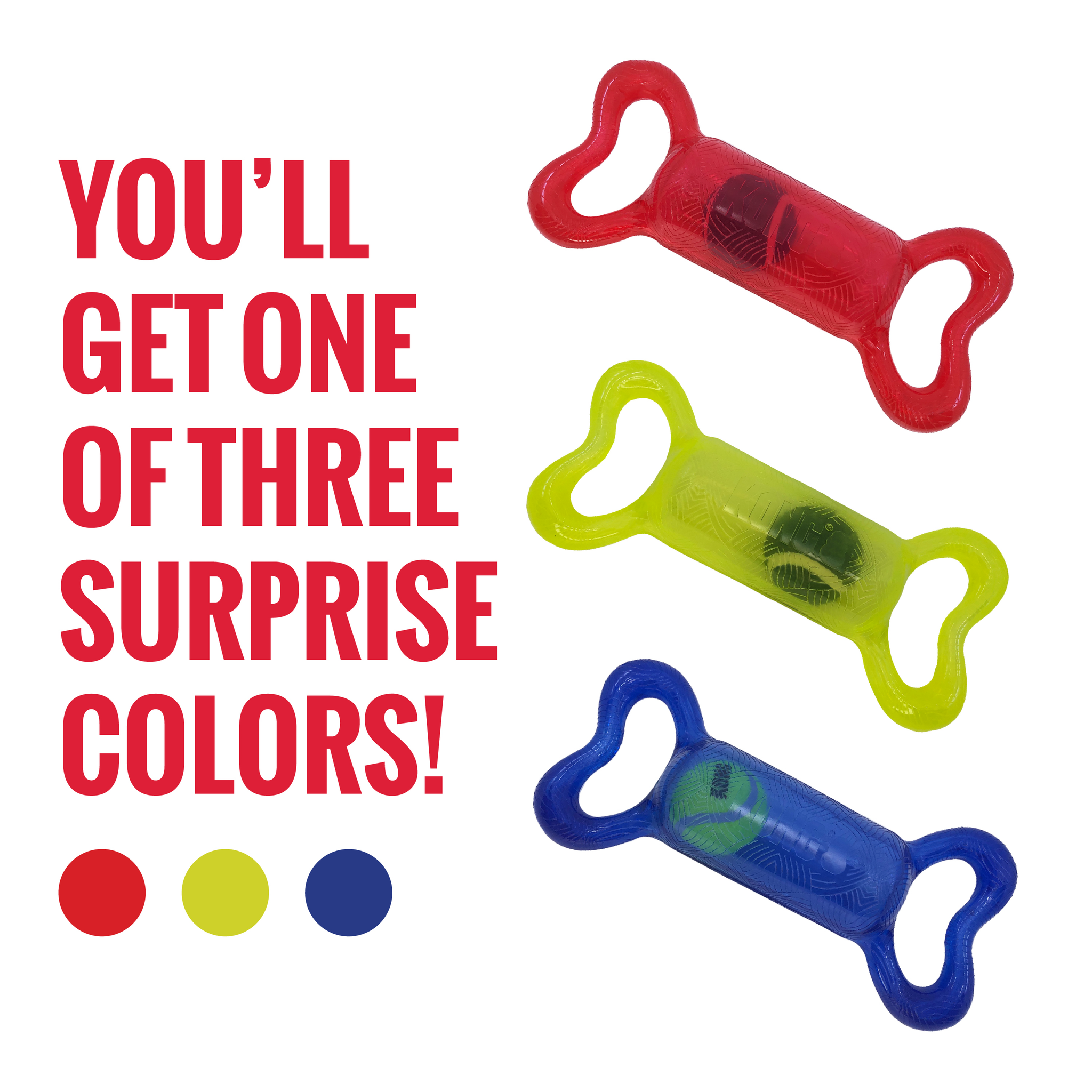 KONG Jumbler Tug Bone’s rolling interior tennis ball and loud squeak spark tug-and-fetch fun. This durable toy is built to last through tough play with two handles that make tugging and shaking easy for long-lasting rounds of interactive play.